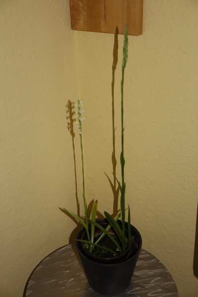Wasserpflanzenfreund Stephan Mitschik, der auch des Öfteren die Treffen der Regionalgruppe als Redakteur protokolliert und als Artikel hier veröffentlicht, präsentierte seine Kulturen der Wasserorchidee Spiranthes odorata, die dieses Jahr erstmals seit dem Jahr 2011 wieder zu blühen begann – und das gleich in zwei Töpfen mit insgesamt drei spiraligen Blütenständen aus jeweils bis zu zwanzig weißen Blüten! Weiter so!!