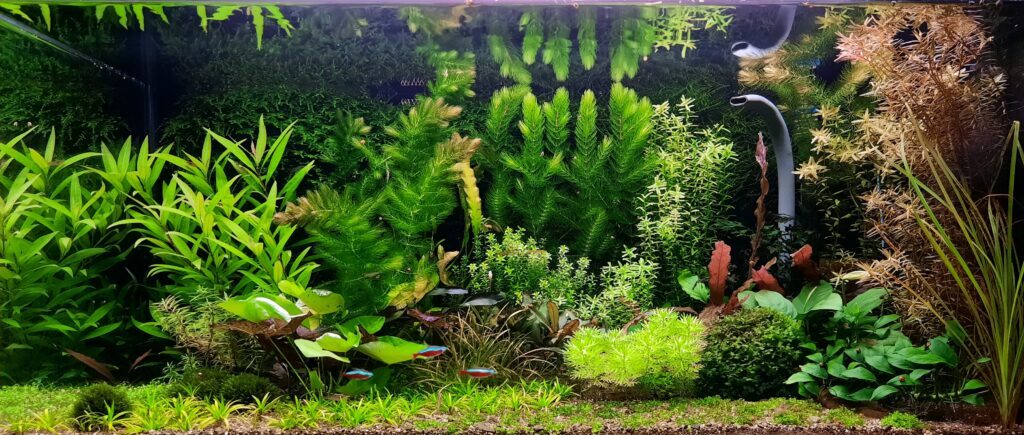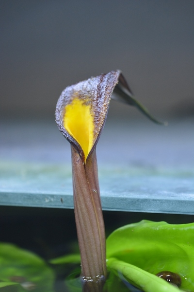 Der Pflanzenbesatz wechselt ständig, da Thorsten natürlich immer bei unserem Pflanzenlotto mitmacht und die gewonnen „Schützlinge“ irgendwo unterbringen muss. Aktuell sind es Pflanzen der Gattungen Rotala (macranda und rotundifolia), Alternanthera, Heteranthera, Aponogeton (crispus, undulatus), Helanthium, Schismatoglottis und prächtige Solitärpflanzen wie die Nymphea (lotus ‚rot‘). Heimlicher Liebling ist Barclaya longifolia (spec. ‚Kambodscha‘), die immer wieder Blüten an die Wasseroberfläche schiebt.