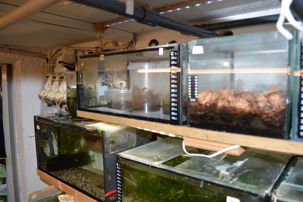 Als nächstes wurde den Besuchern ein mehrere Meter langes Bachbecken vorgestellt, das Albert Schmid aus Landshut mit Osmosewasser betreibt und das als Bodengrund Sand aus dem Bayerischen Wald hat. Ohne Dünger wachsen dort Javamoos, verschiedene Cryptocorynen, Simse und Heteranthera. Bei einer Wasser-Gesamthärte von 2 kommt es hier zu gigantischem Pflanzenwuchs, der regelmäßig im Zaum gehalten werden muss.