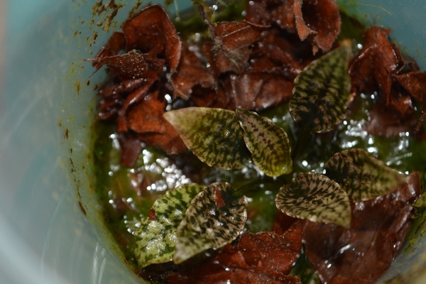 Eine Erfindung von Walter: Becherkulturen im Aquarium – aber nur als Behältnis zur gemeinsamen Beleuchtung, versteht sich! Hier war Mißbicher vor allem von C. elliptica angetan: ein kleines Blättchen von der Blattbasis eines großen Blattes abgerissen reicht aus. Dann dieses Blättchen auf die Buchenlauberde legen – und alles andere geschieht von selbst. Das Blättchen bildet Wurzeln, und bald hat man mehrere Blätter, die aus dem Substrat wachsen! TOLL!! Ebenso faszinierend sind die gemaserten Blätter von C. striulata. Einfach ein Blickfang! C.weizii konnte Walter auch in Becherkultur halten.