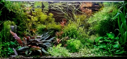Eine Besonderheit seines Aquariums stellt die 12 cm hohe Quarzit-Terrasse dar, die er im leeren Aquarium befestigte, bevor er es mit schwarzem Basaltsplit befüllte. Die Bodengrundheizung (in Schleifen verlegtes Kabel) stellte sich im Nachhinein allerdings als Problem beim Umsetzen von tief wurzelnden Pflanzen heraus, da man immer Gefahr lief, mit der Pflanze auch das Kabel herauszuziehen. Gedüngt wird das Pflanzenaquarium mit einem selbstgemixten Spurenelemente- und NPK-Dünger.