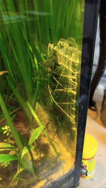 Jochen hatte sich bereiterklärt, für den VDA-Bundeskongress in Dachau Ende April 2017 ein Nanobecken für die dortige Ausstellung einzurichten. Dabei kam ein Vio40 30-Liter-Aquarium von Juwel zum Einsatz. Quarzkies mit hohem Eisengehalt, ein selbstgebastelter CO2-Ansatz, sowie ein Stück Fußmatte, auf die mit einem Haarnetz Javamoos als Tarnung für den Innenfilter diente, waren die Zutaten für den Start der Einrichtung. Helanthium tenellum, Hydrocotyle tripatita, Limnophila, sowie Anubias nana bildeten die Startformation als Wasserpflanzen in dem Becken. Mit Bindedraht aus dem 1-€-Shop band Jochen zudem noch Süßwassertang auf einen Stein auf. Durch geschicktes Einpflanzen gelang es innerhalb von sieben Wochen, dass der Eindruck eines Rasens aus ineinander verwachsenen Pflanzen entstand. Eine blaue Folie sorgte für erhöhte Tiefenwirkung beim Blick in das Aquarium, während der Blick auf den Kies mit schwarzer Folie verdeckt wurde.