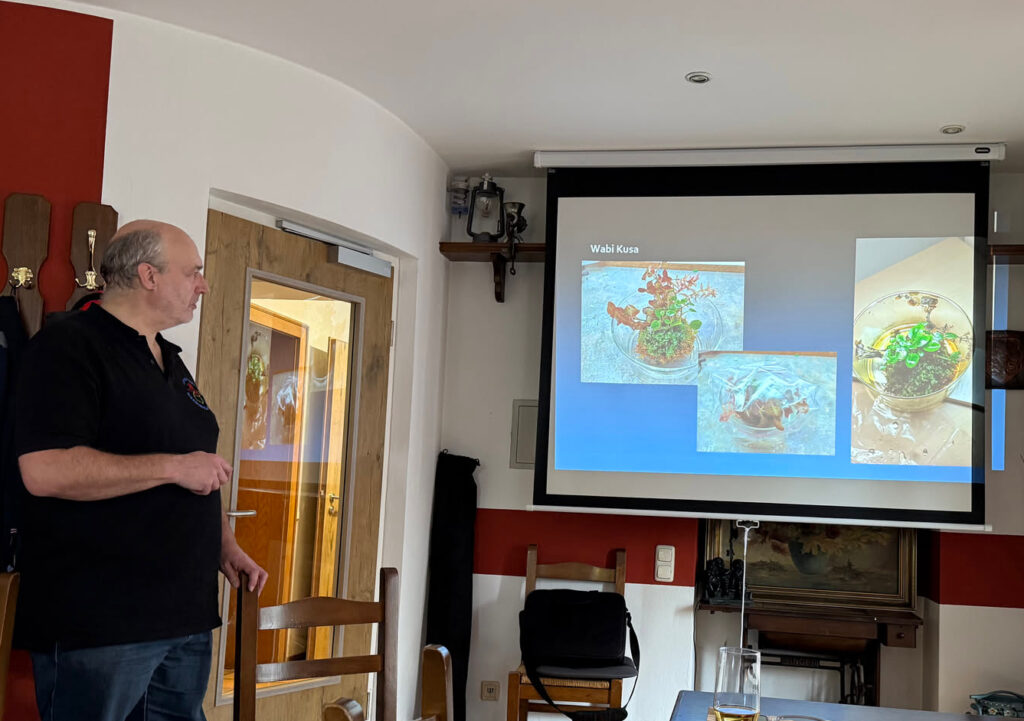 Jörg hat viele Bilder im Gepäck und erklärt die einzelnen Aspekte, auch wenn ihm der Beamer einen „Strich durch die Rechnung macht“. Viel Interesse wecken seine Wabikusa-Experimente, also Pflanzenpflege in Vasen/Gläsern, sowie die Becherkultur von Cryptocoryne (Wasserkelche). Fragen gibt es einige, die wir gemeinsam im Anschluss an den Vortrag diskutieren.